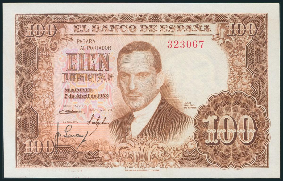 100 Pesetas. 7 de Abril de 1953. Sin serie. (Edifil 2017: 464). Imperceptible doblez vertical y consevando parte del apresto original. EBC+.