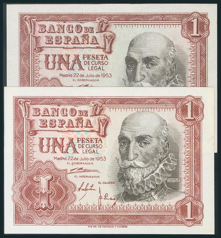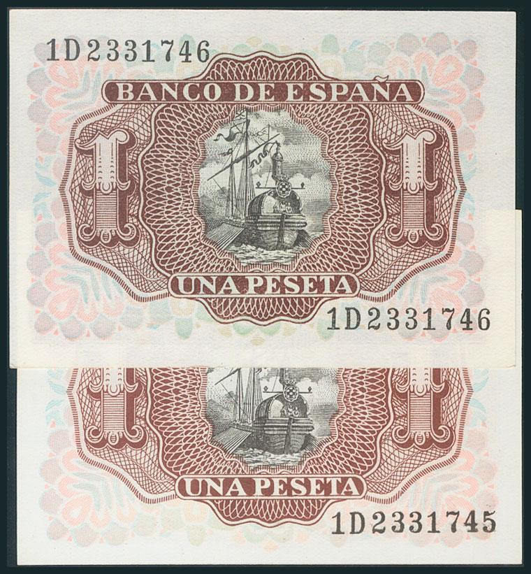 1 Peseta. 22 de Julio de 1953. Pareja correlativa. Serie 1D. (Edifil 2017: 465a). SC/SC-.