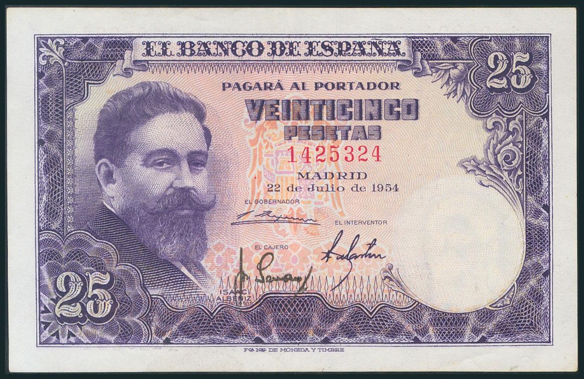 25 Pesetas. 22 de Julio de 1954. Sin serie. (Edifil 2017: 467). Apresto original. EBC.