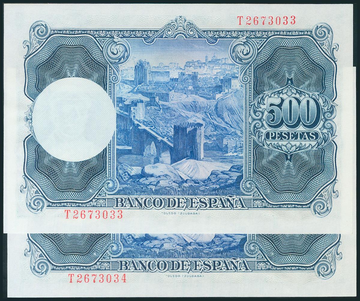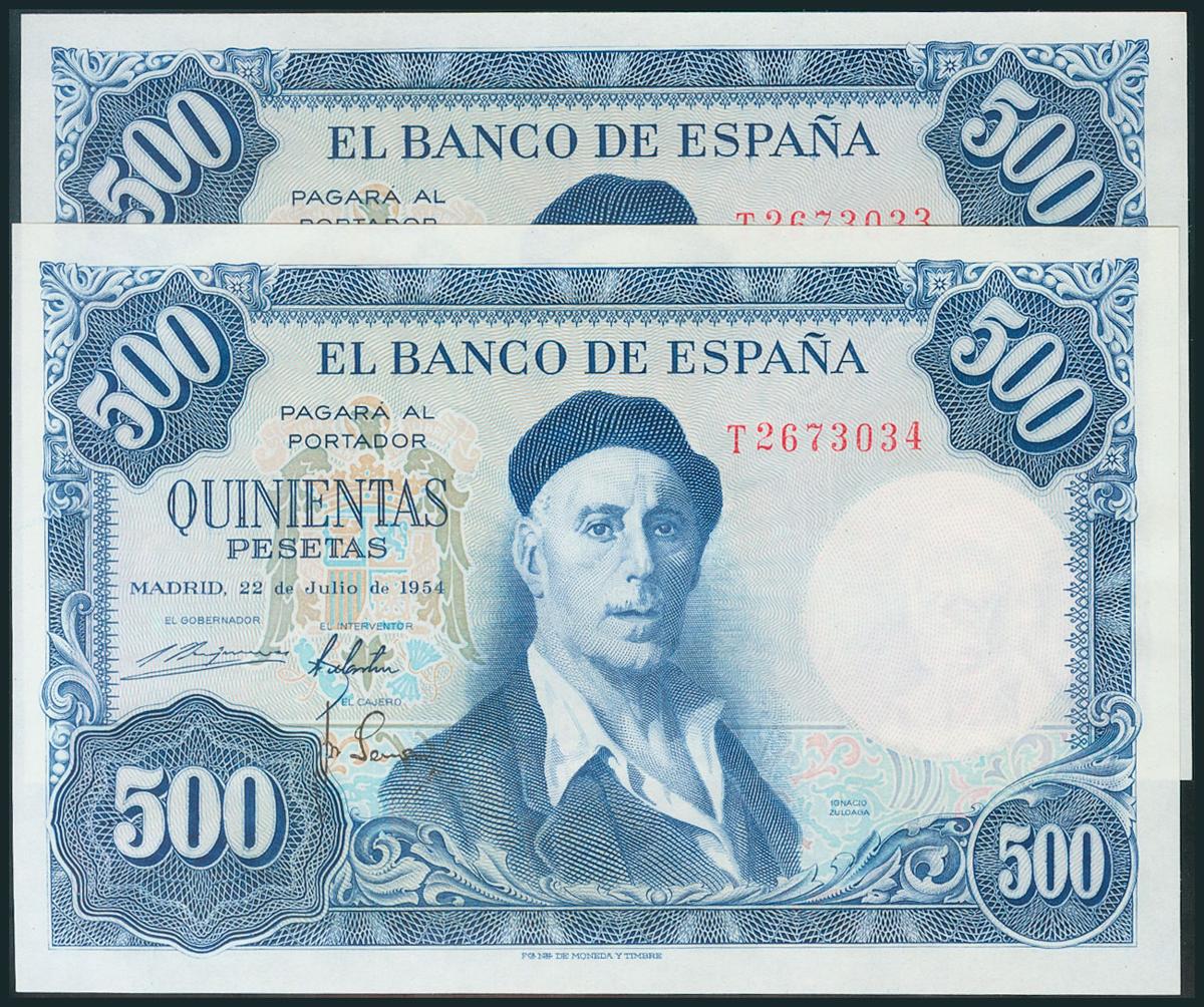 500 Pesetas. 22 de Julio de 1954. Pareja correlativa. Serie T. (Edifil 2017: 468b). Apresto original. SC.