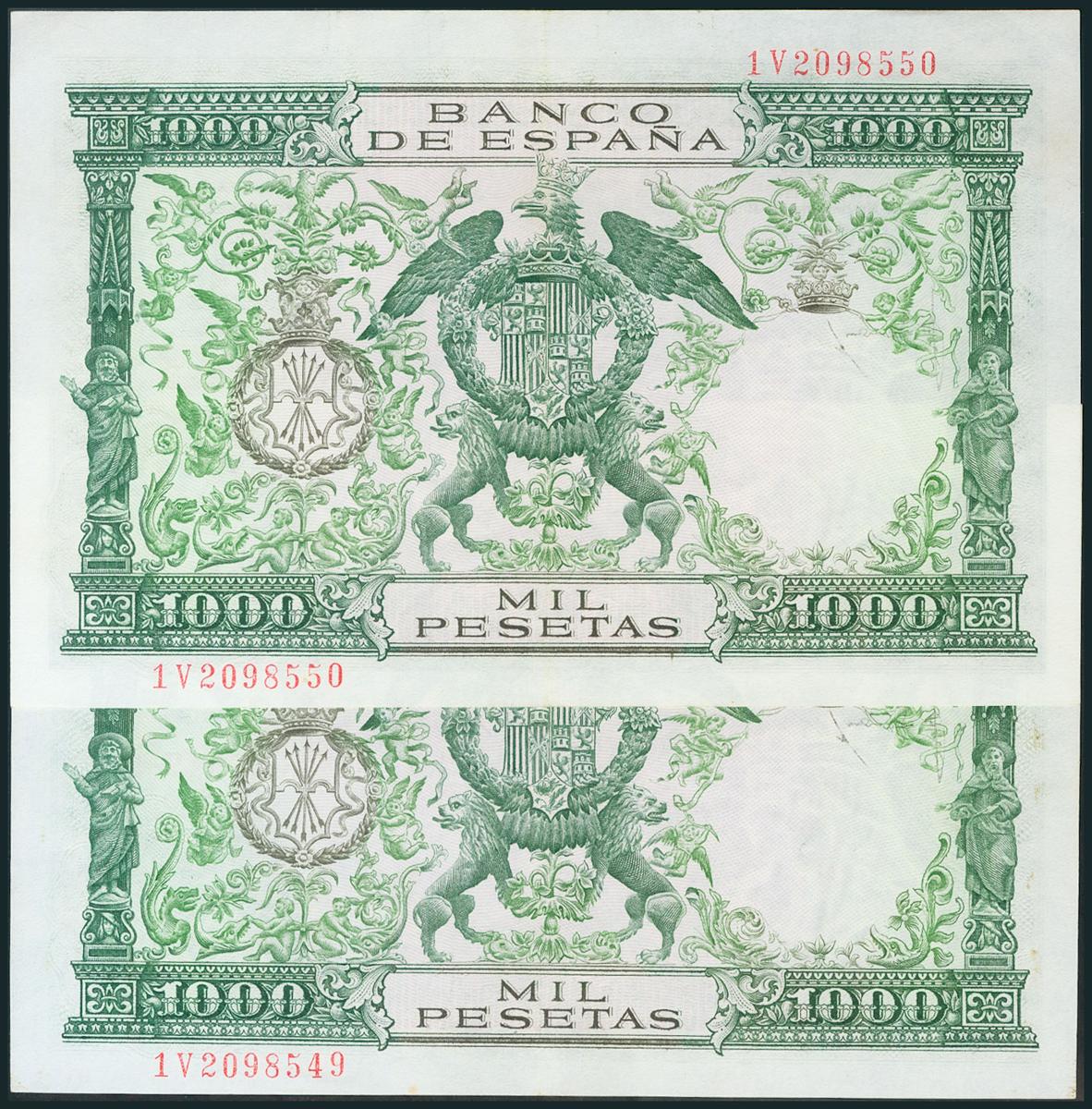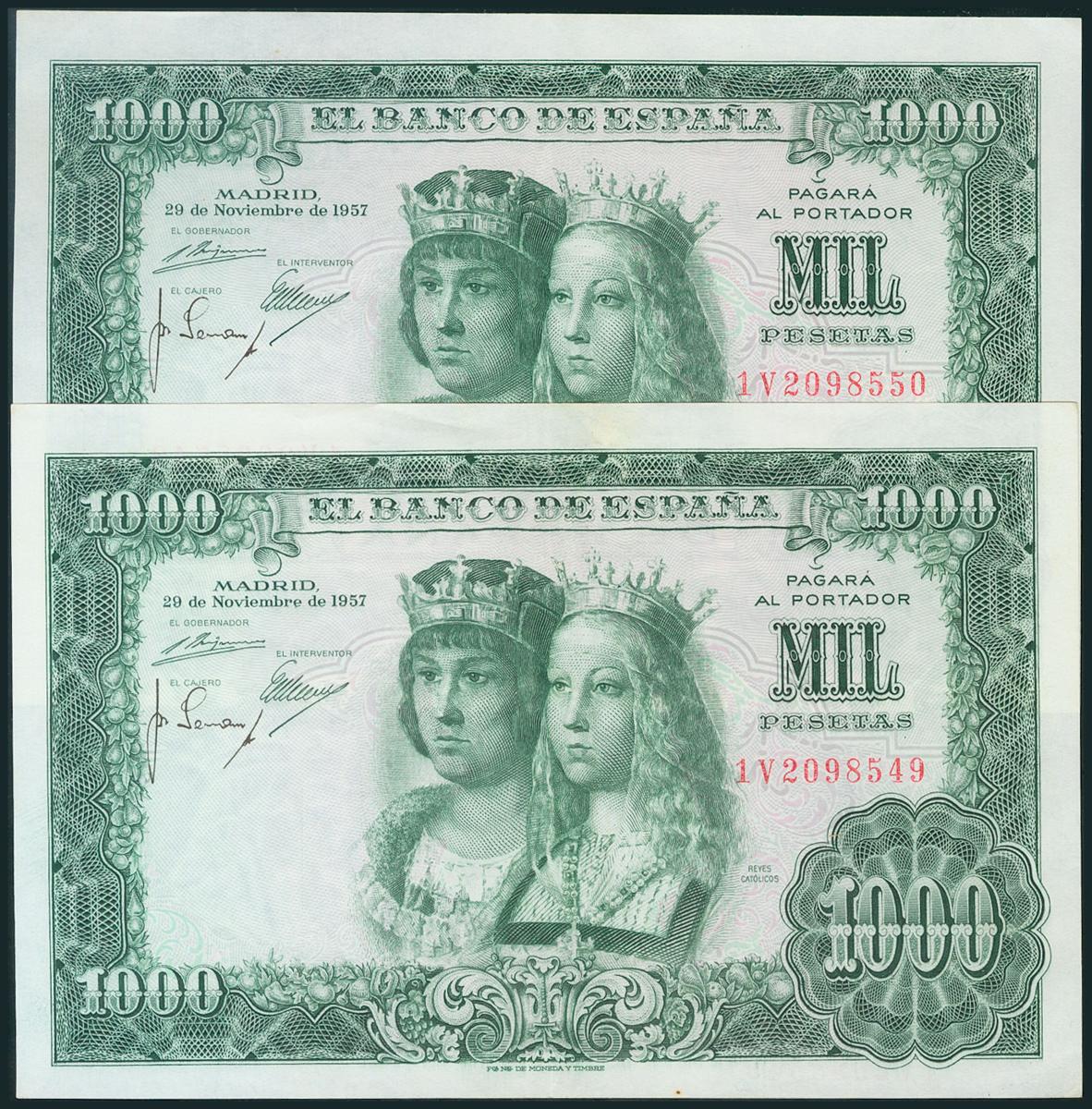 1000 Pesetas. 29 de Noviembre de 1957. Pareja correlativa. Serie 1V. (Edifil 2017: 469b). EBC.