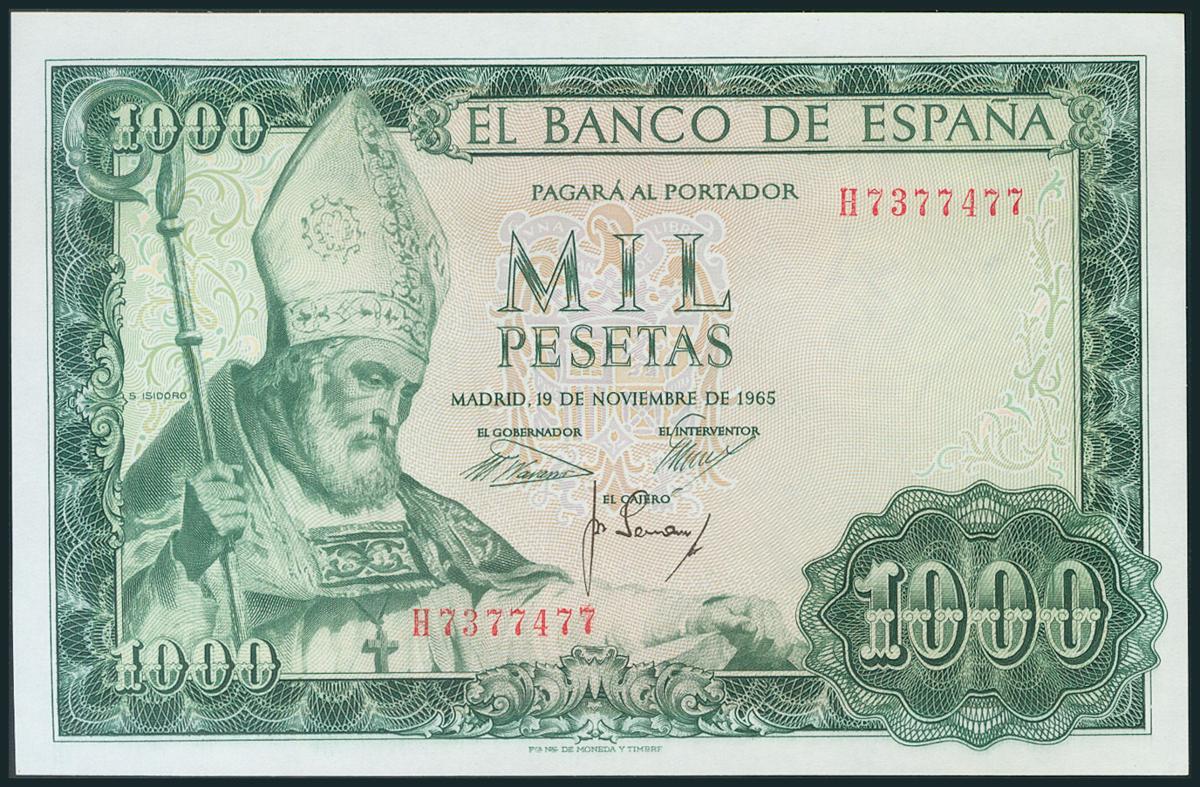 1000 Pesetas. 19 de Noviembre de 1965. Serie H. (Edifil 2017: 471b). Apresto original. SC.