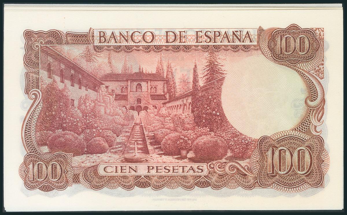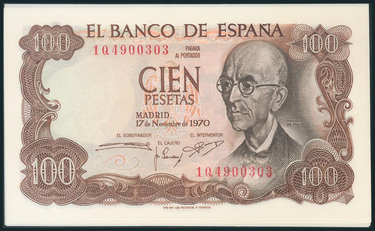 Conjunto de 6 billetes de 100 Pesetas correlativos emitidos el 17 de Noviembre de 1970, con la serie 1Q. (Edifil 2017: 472c). SC.