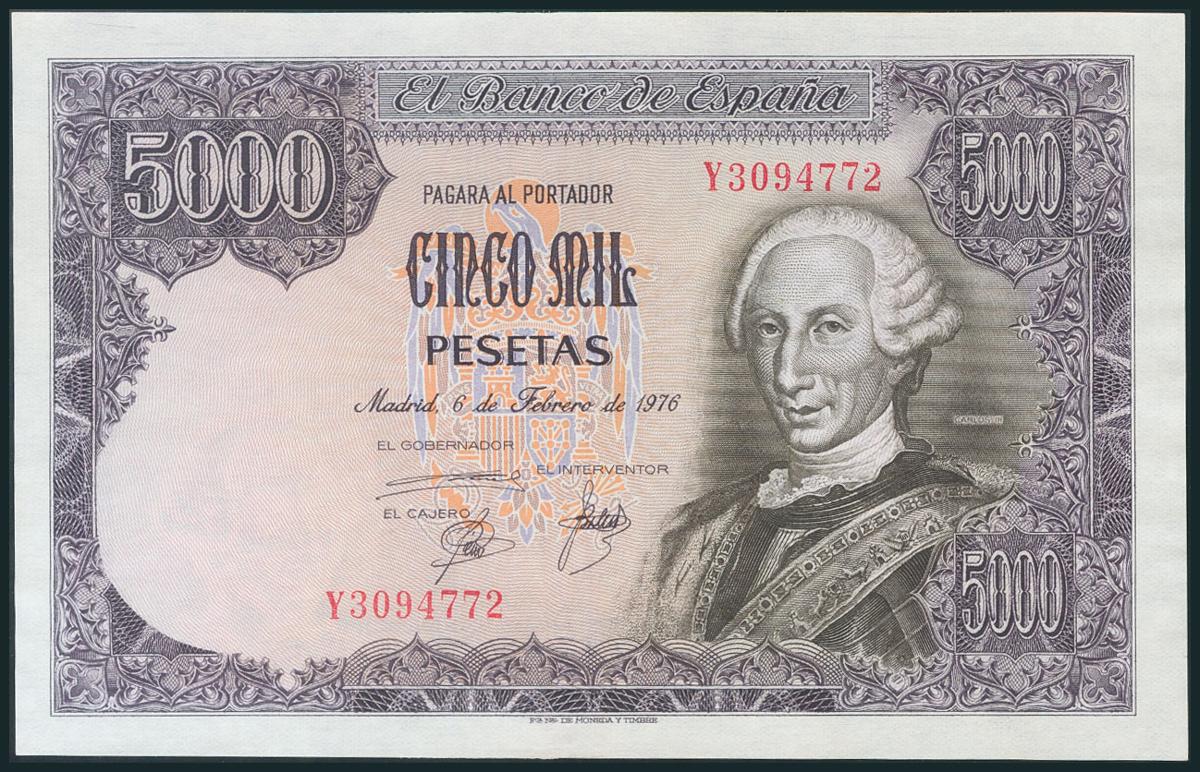 5000 Pesetas. 6 de Febrero de 1976. Serie Y. (Edifil 2017: 475). Pequeñas ondulaciones en el margen derecho. EBC+