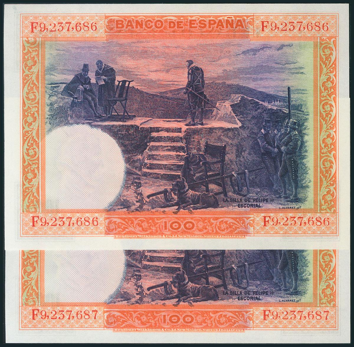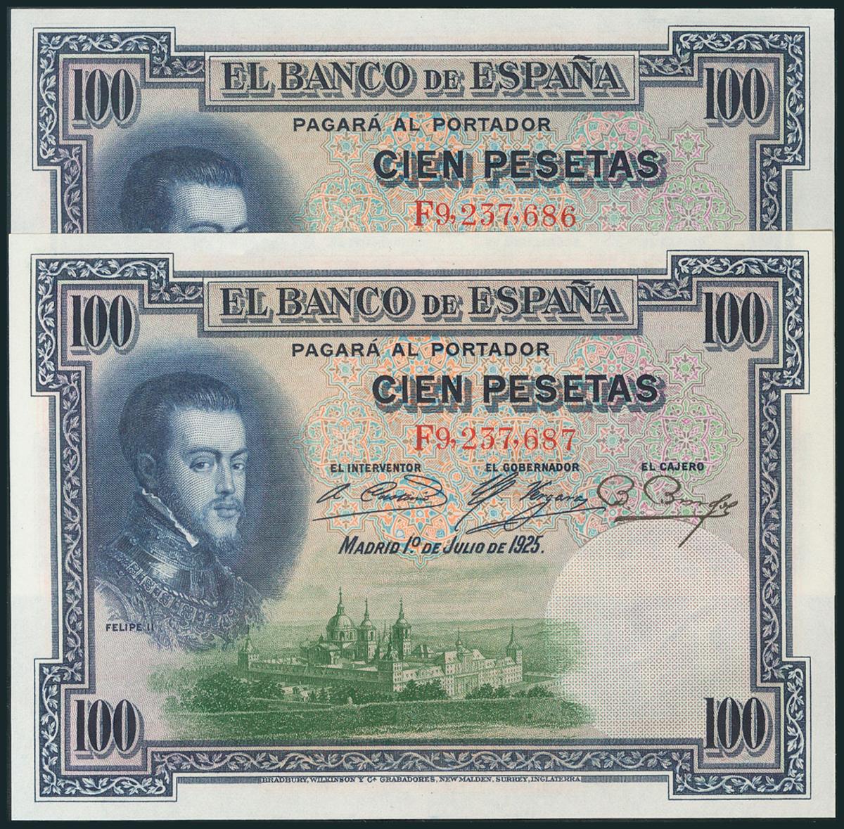 100 Pesetas. 1 de Julio de 1925. Pareja correlativa. Serie F. (Edifil 2017: 350). Apresto original. SC-.