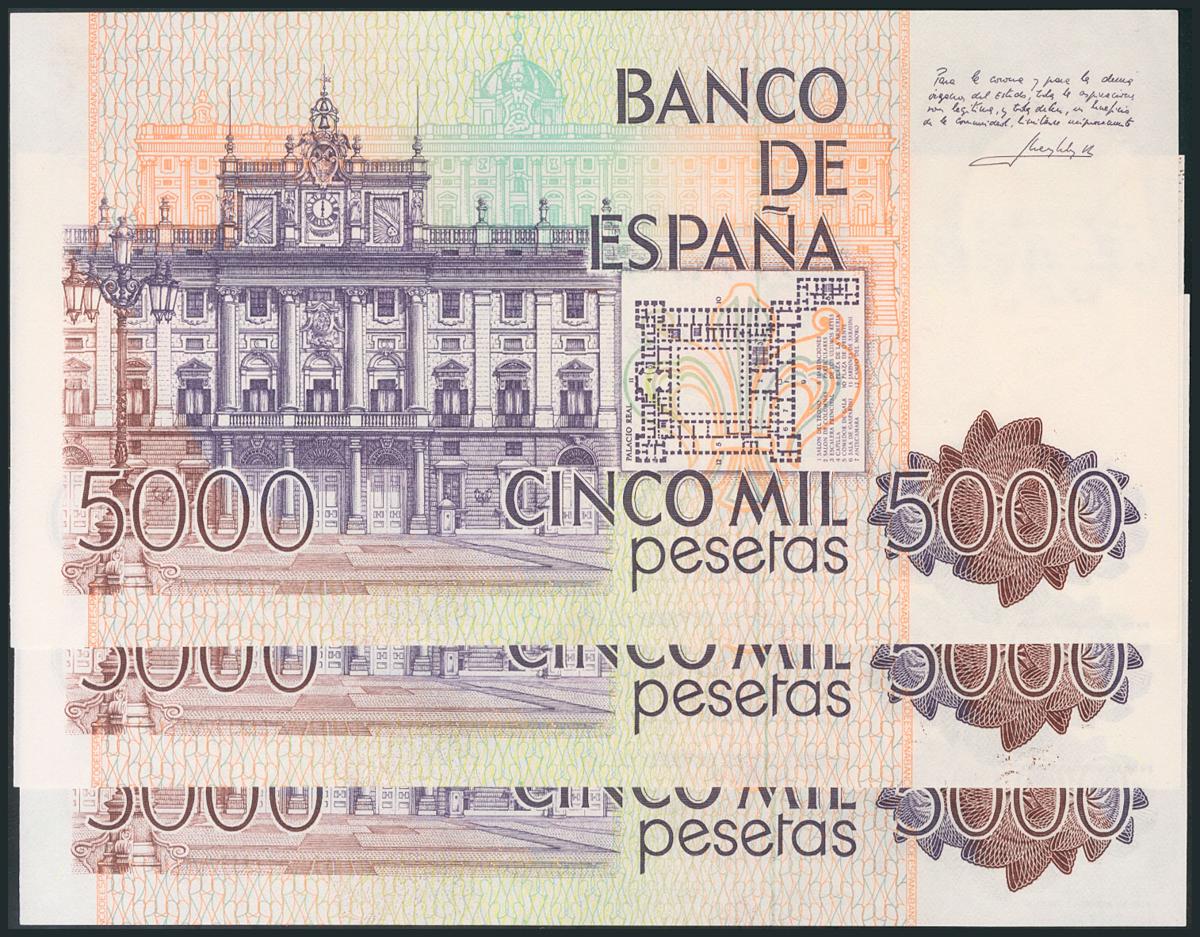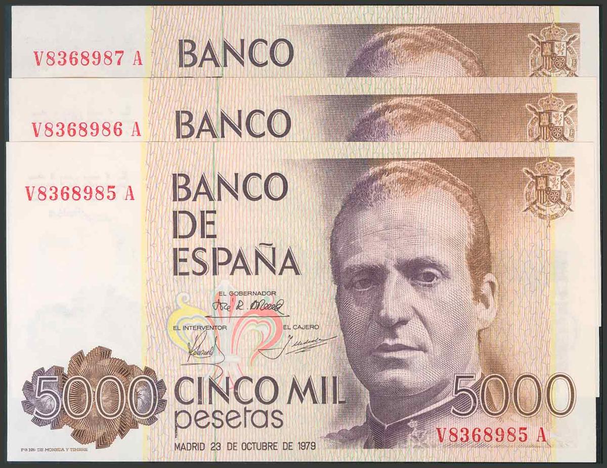 5000 Pesetas. 23 de Diciembre de 1979. Trío correlativo. Serie T. (Edifil 2017: 478a). SC-.