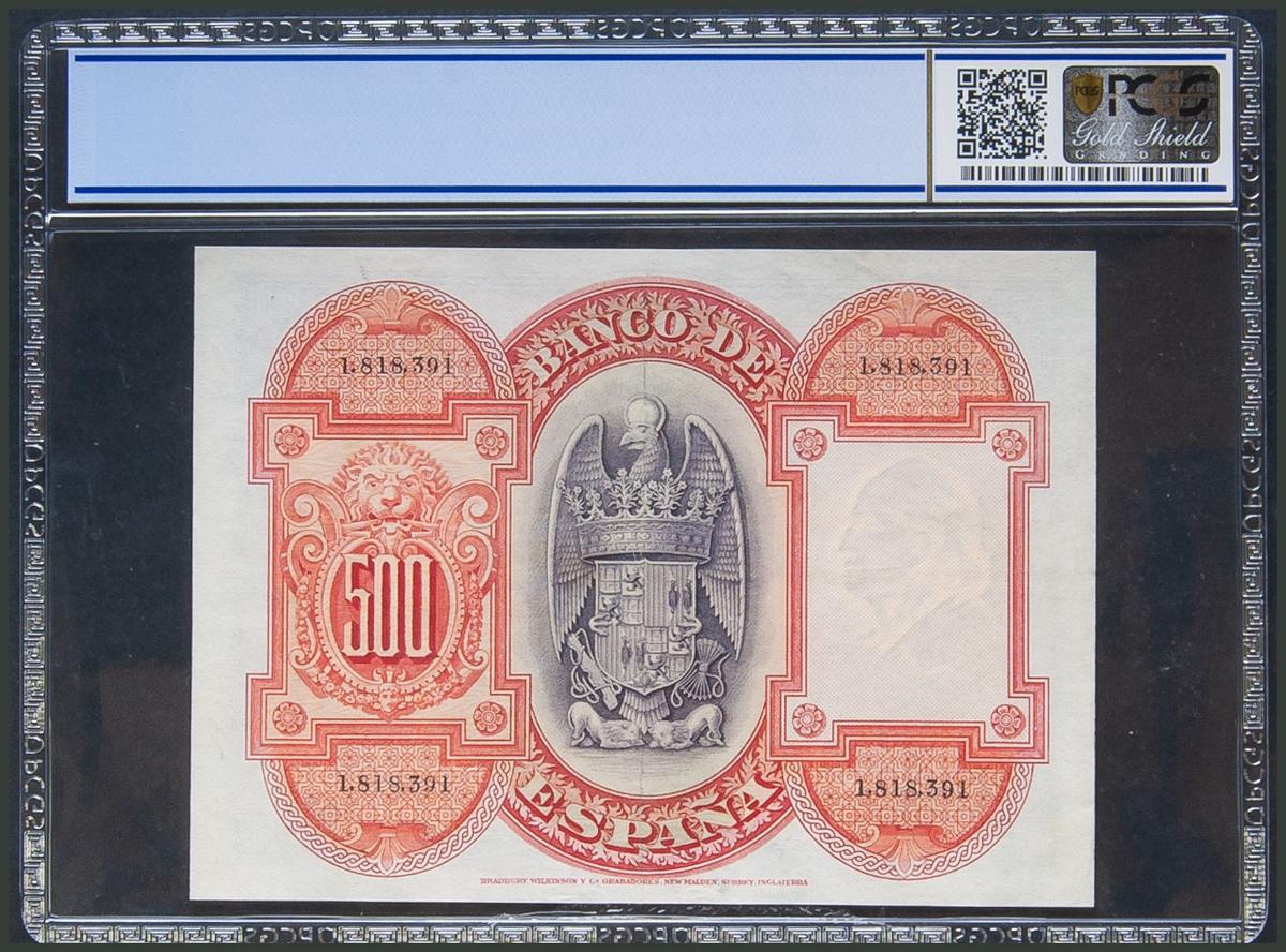 500 Pesetas. 24 de Julio de 1927. Sin serie. (Edifil 2017: 352, Pick: 73c). Gran parte del apresto original. EBC+. Encapsulado PCGS58.