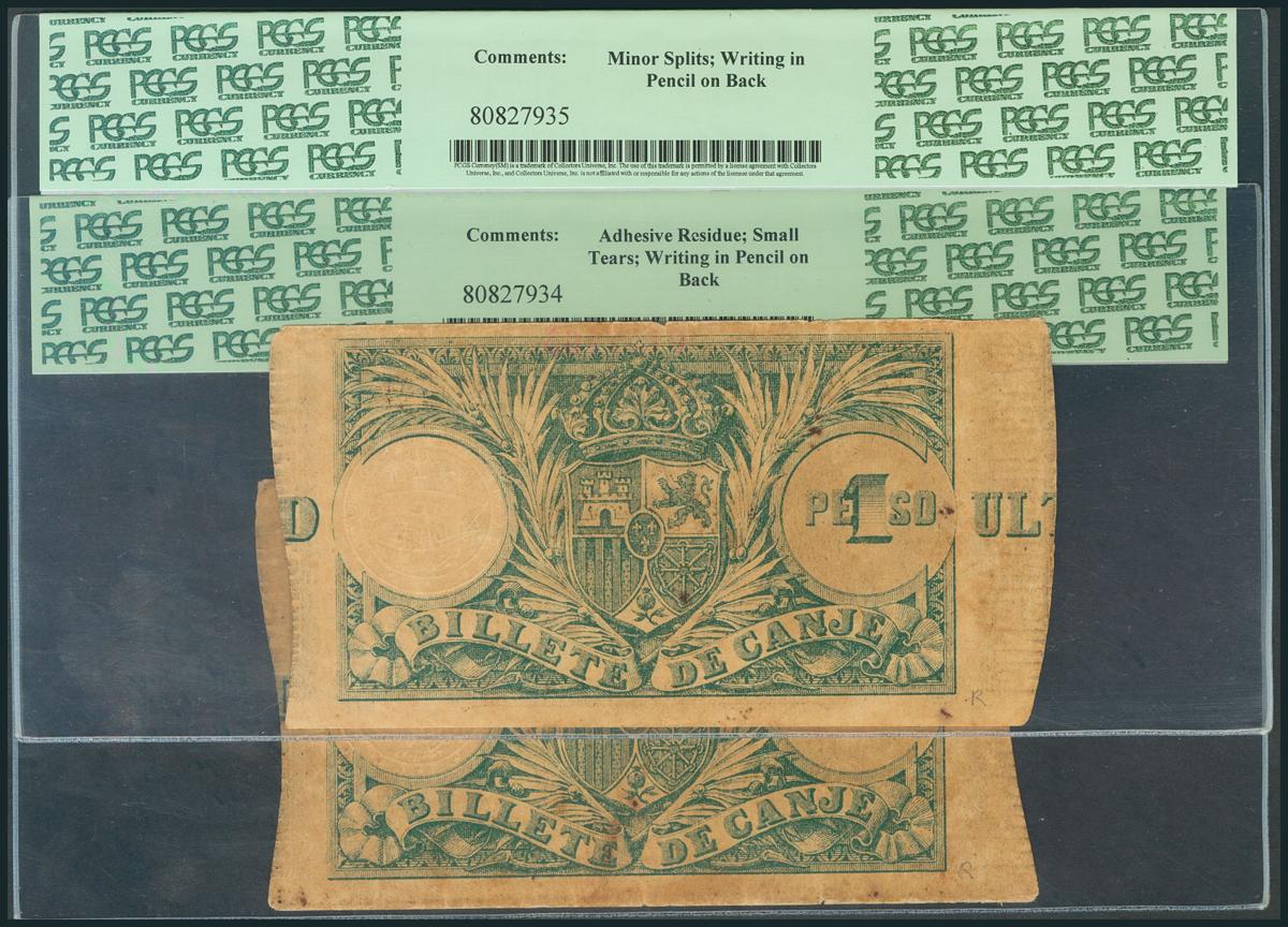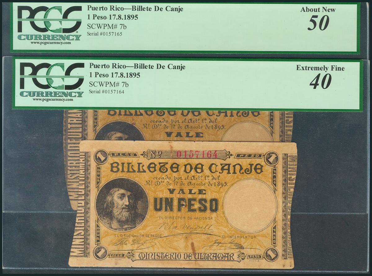 PUERTO RICO. 1 Peso. 17 de Agosto de 1895. Billete de Canje. Pareja correlativa. (Edifil 2017: 11, Pick: 7b). Encapsulado por PCGS50/PCGS40.