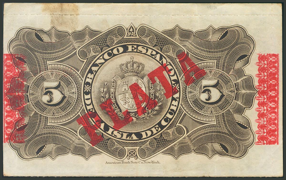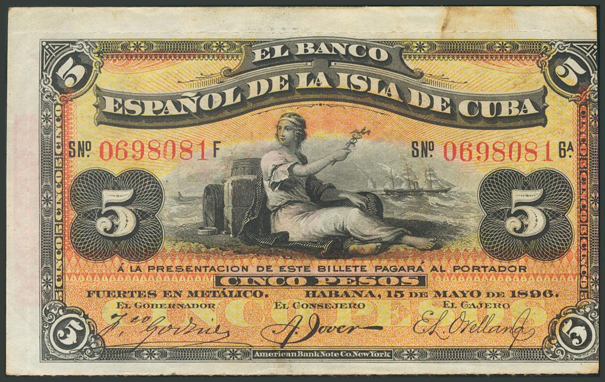 CUBA. 5 Pesos. 15 de Mayo de 1896. Banco de la Isla de Cuba. Serie F. (Echenagusía: 48). MBC+.