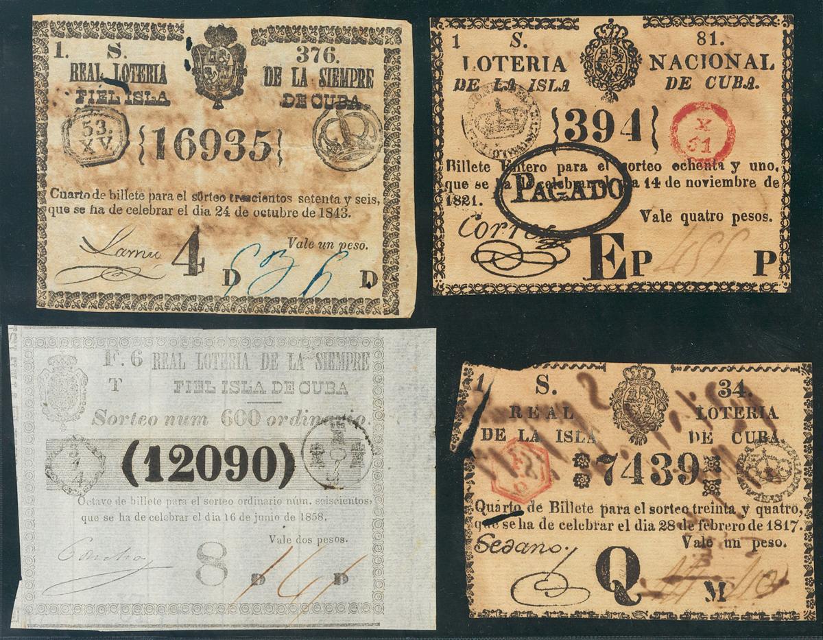 LOTERIA (ISLA DE CUBA). Lote compuesto por 4 Décimos de lotería pertenecientes a la Isla de Cuba bajo el reinado de Fernando VII e Isabel II, estos por valor de 1 Peso (1817, 1821, 1843) y 2 Pesos (1858). MBC/MBC+. A EXAMINAR.