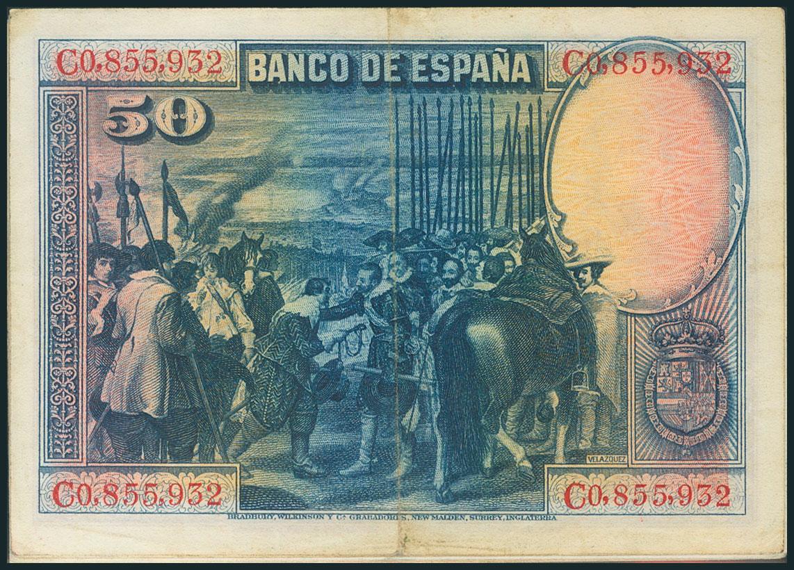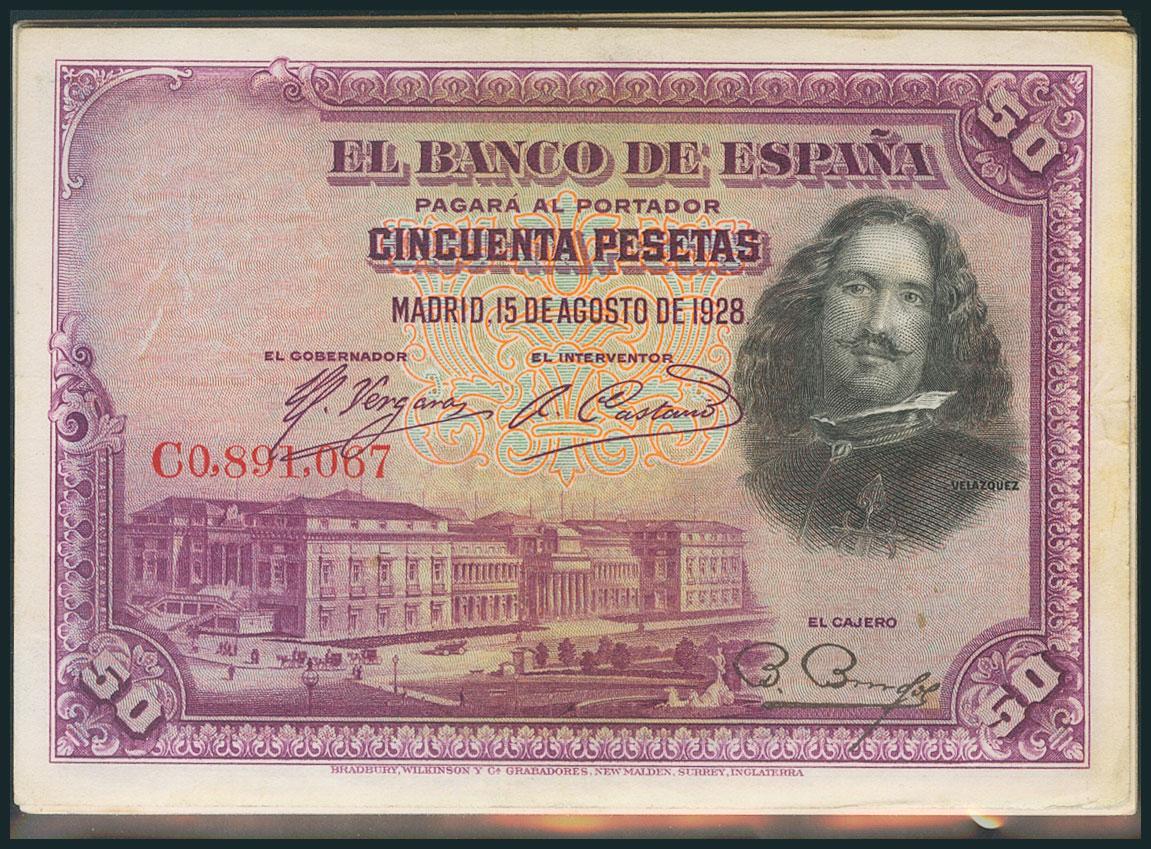Conjunto de 14 billetes de 50 Pesetas emitidos el 15 de Agosto de 1928 de diversas series y diferentes calidades (Edifil 2017: 354). EBC/MBC-.