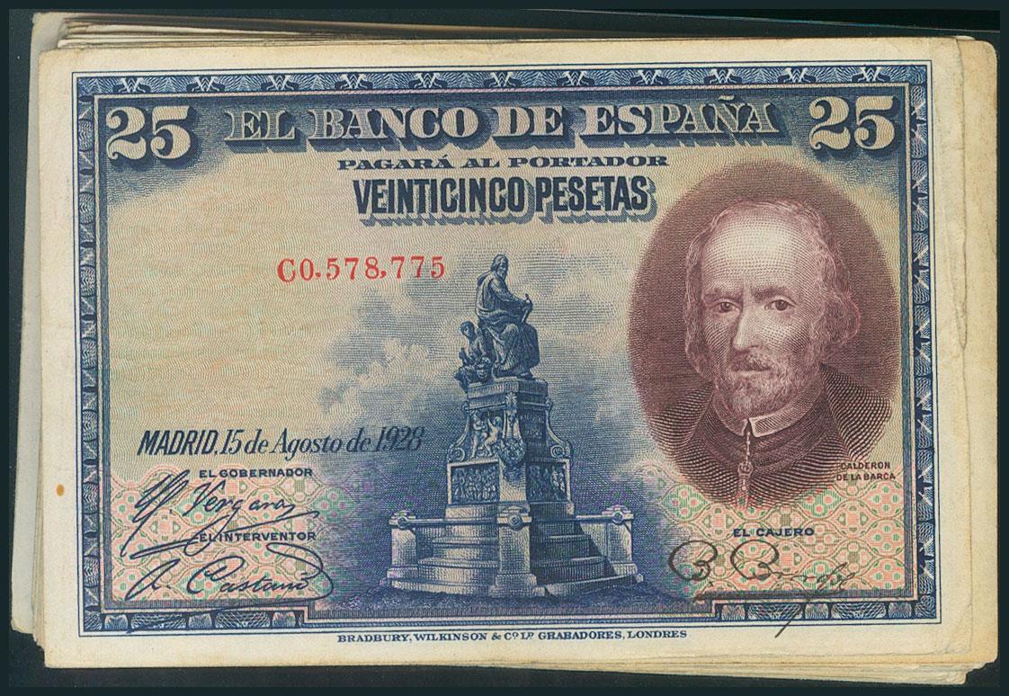 Conjunto de 28 billetes de 25 Pesetas emitidos el 15 de Agosto de 1928 con diversas series y diferentes calidades (Edifil 2017: 353). EBC/BC.