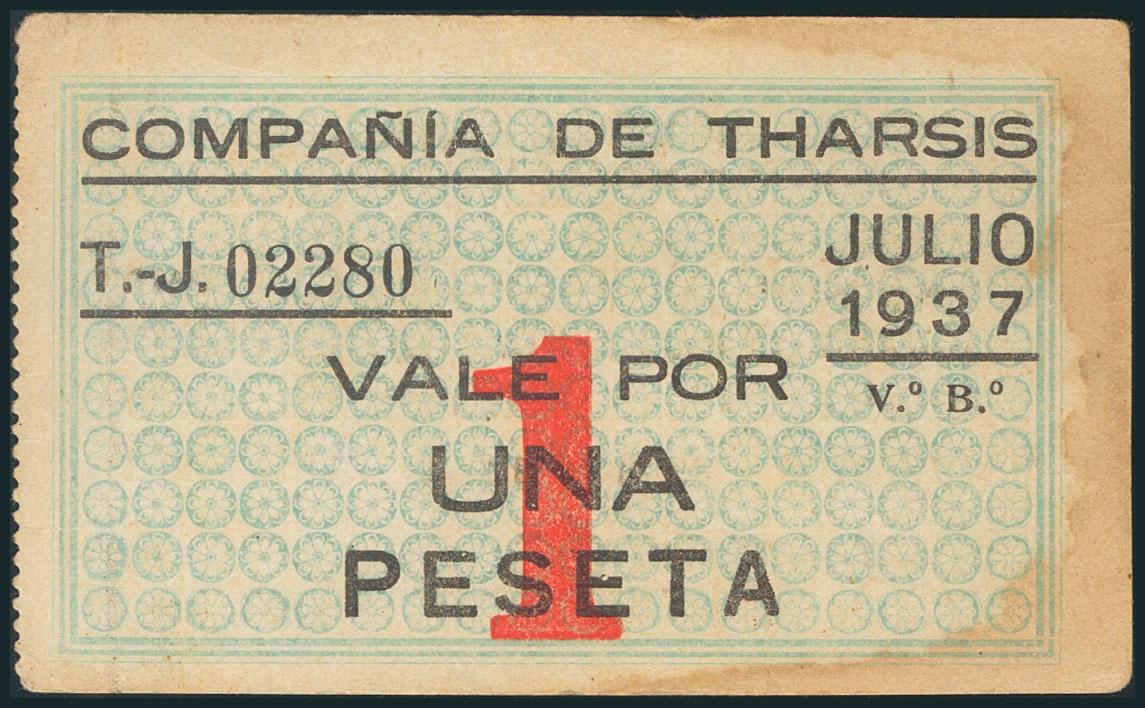 COMPAÑIA DE THARSIS (HUELVA). 1 Peseta. Julio 1937. No catalogado, probablemente único conocido. MBC.