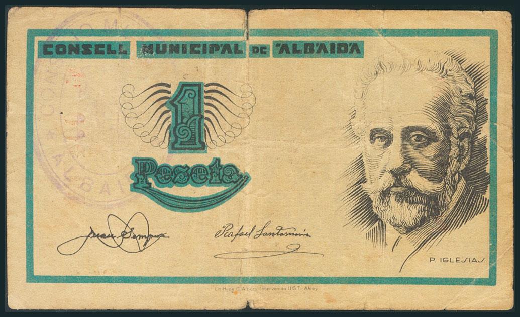 ALBAIDA (VALENCIA). 1 Peseta. (1938ca). (González: 145). RC.