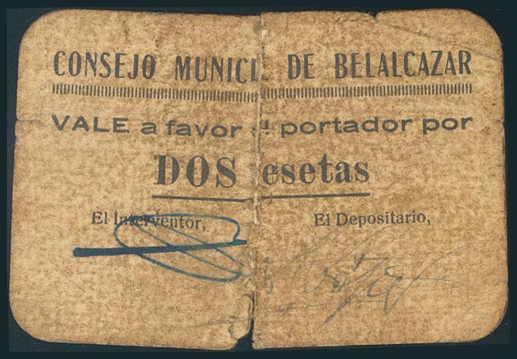 BELALCAZAR (CORDOBA). 2 Pesetas. 1938. (González: 949). Billete cosido. RC.