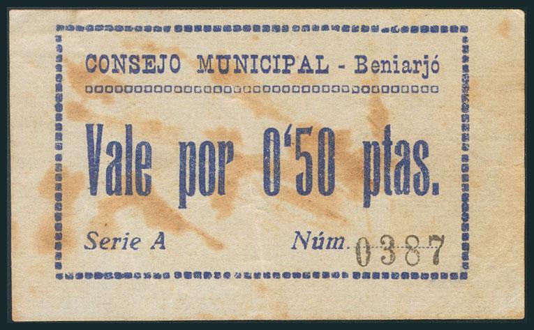 BENIARJO (VALENCIA). 50 Céntimos. 1938. Serie A. (González: 1063). MBC. (coincide con el fotografiado en la obra de Rafael González Hidalgo).