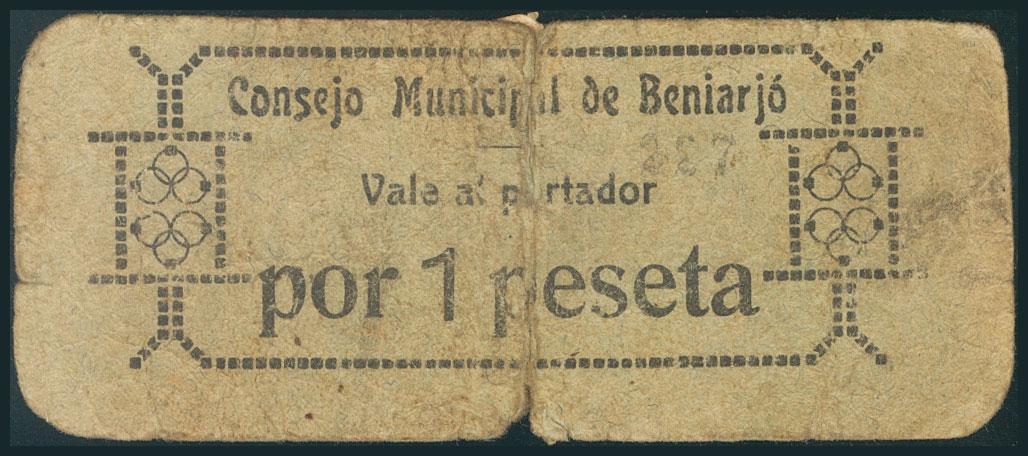 BENIARJO (VALENCIA). 1 Peseta. (1938ca). (González: 1065). Raro. RC.