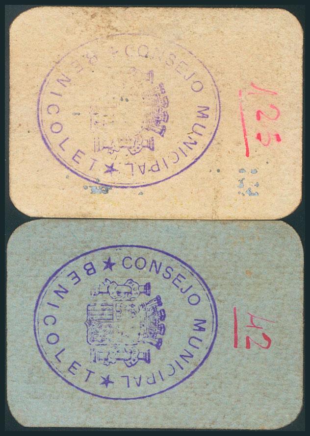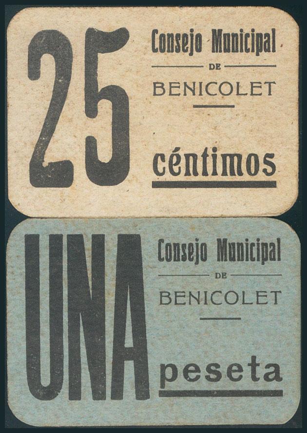 BENICOLET (VALENCIA). 25 Céntimos y 1 Peseta. (1938ca). (González: 1082/83). Raros. EBC. (coincide con los fotografiados en la obra de Rafael González Hidalgo).