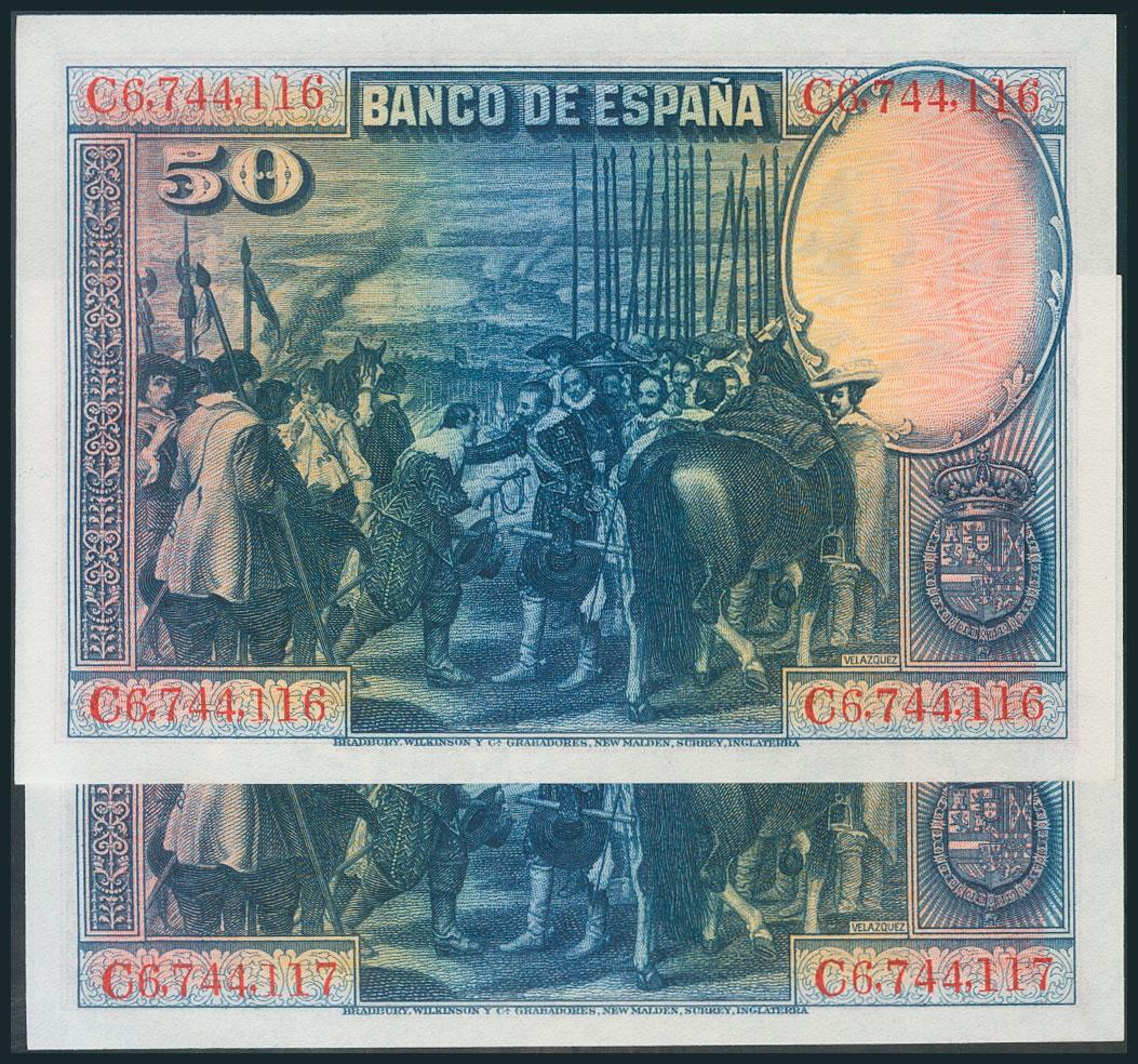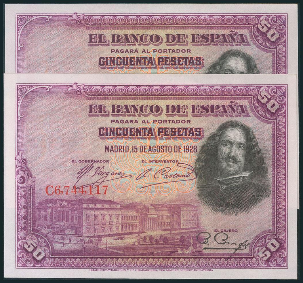 50 Pesetas. 15 de Agosto de 1928. Pareja correlativa. Serie C. (Edifil 2017: 354). SC-.