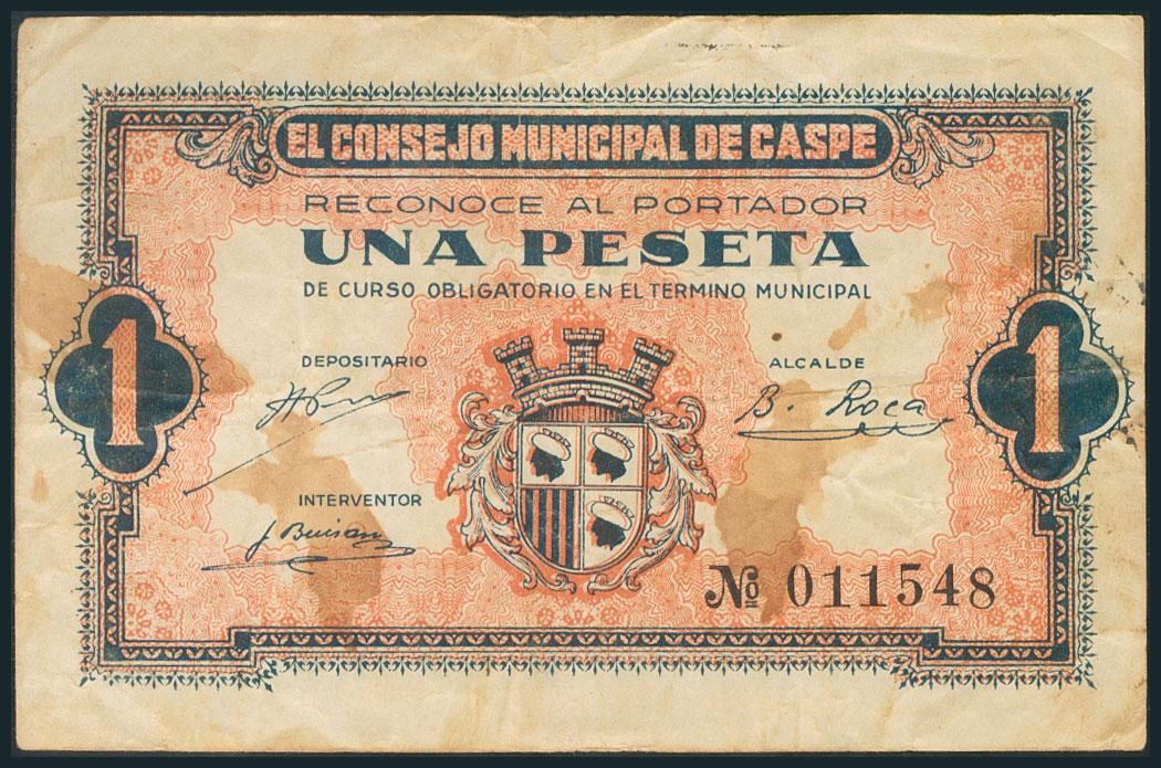 CASPE (ZARAGOZA). 1 Peseta. (1938ca). (González: 1739). BC.