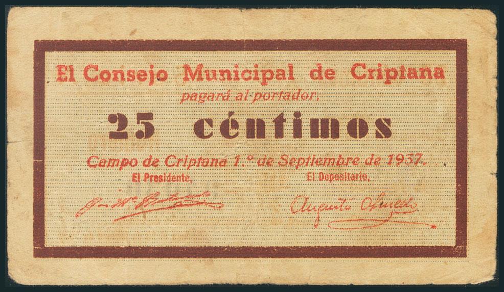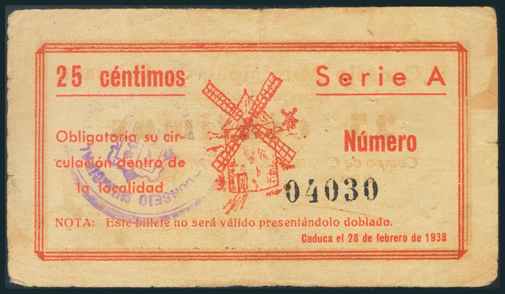 CAMPO DE CRIPTANA (CIUDAD-REAL). 25 Céntimos. 1 de Septiembre de 1937. Serie A. (González: 2096). BC.