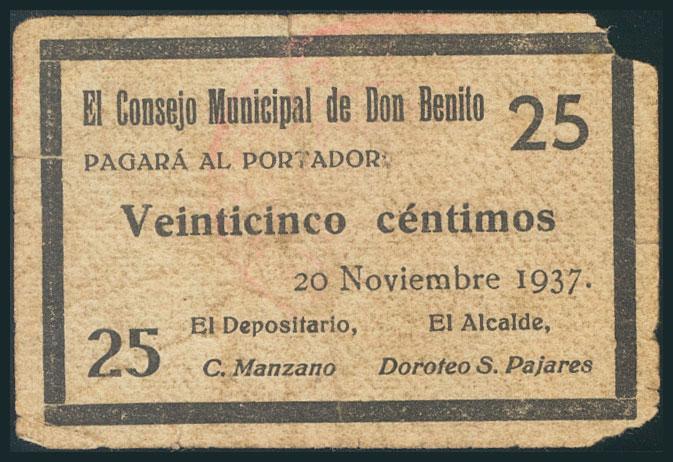 DON BENITO (BADAJOZ). 25 Céntimos. 20 de Noviembre de 1937. (González: 2237). RC.