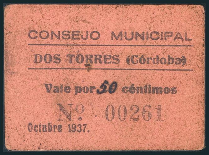 DOS TORRES (CORDOBA). 50 Céntimos. Octubre 1937. (González: 2255). Muy raro. MBC.