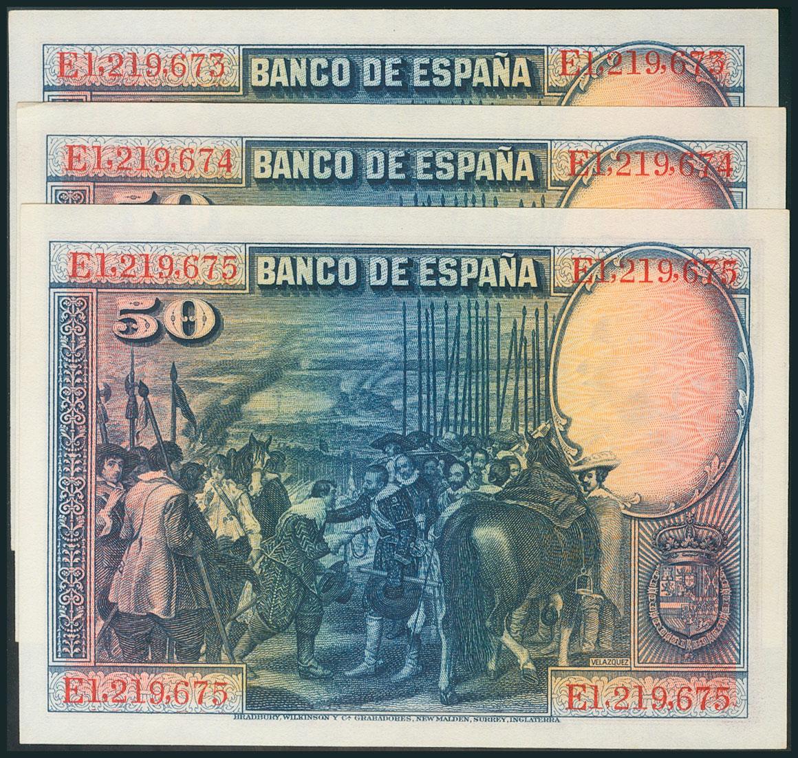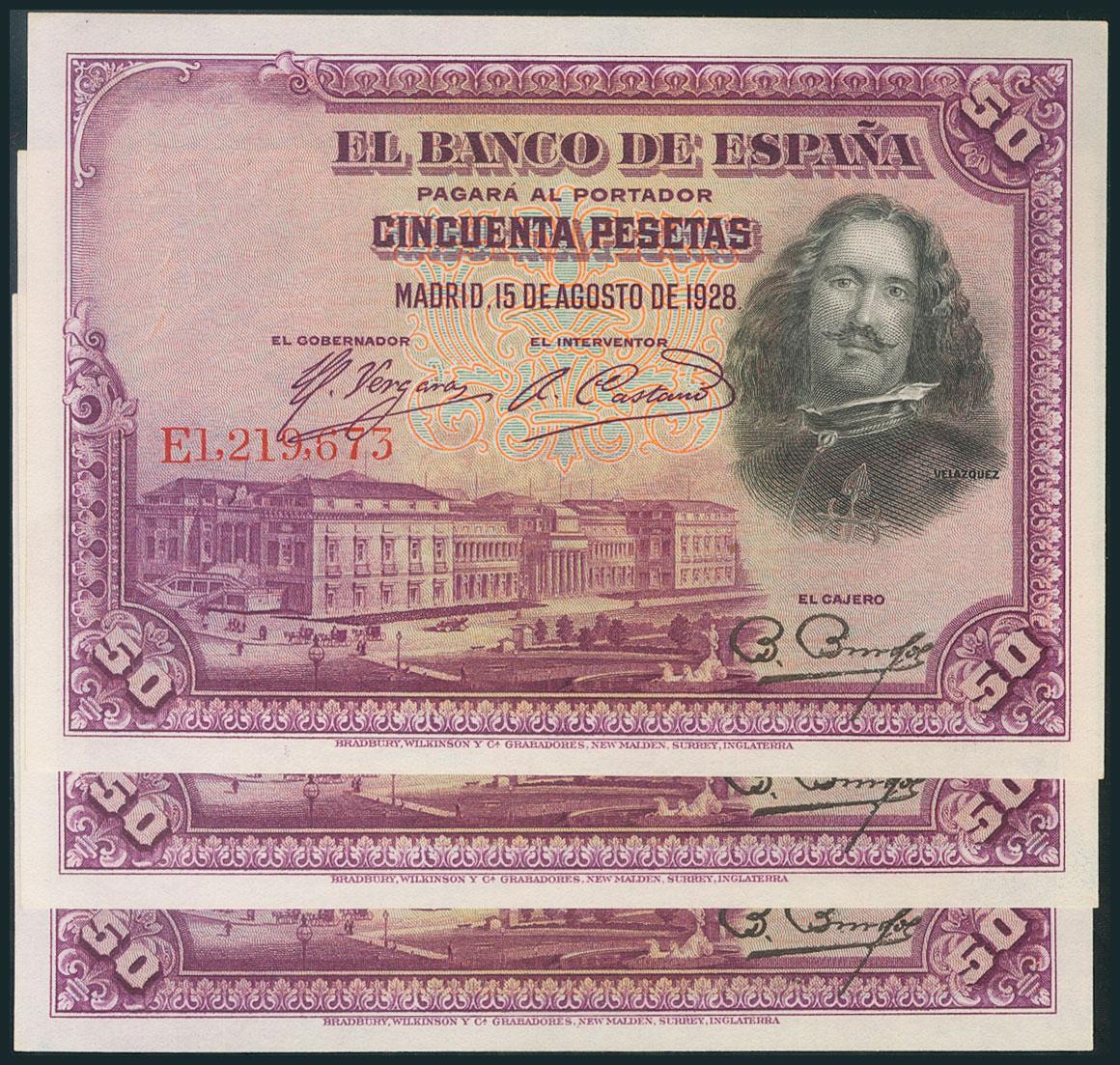 50 Pesetas. 15 de Agosto de 1928. Trío correlativo. Serie E. (Edifil 2017: 354). Apresto original. SC/SC-.