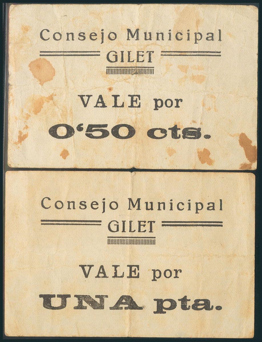 GILET (VALENCIA). 50 Céntimos y 1 Peseta. (1938ca). (González: 2694/95). Rarísimos. BC.