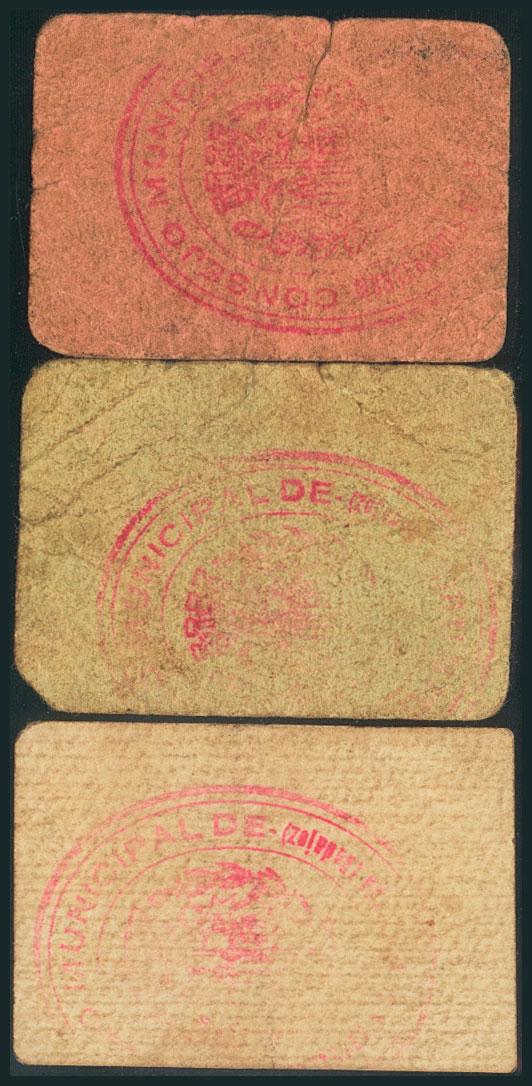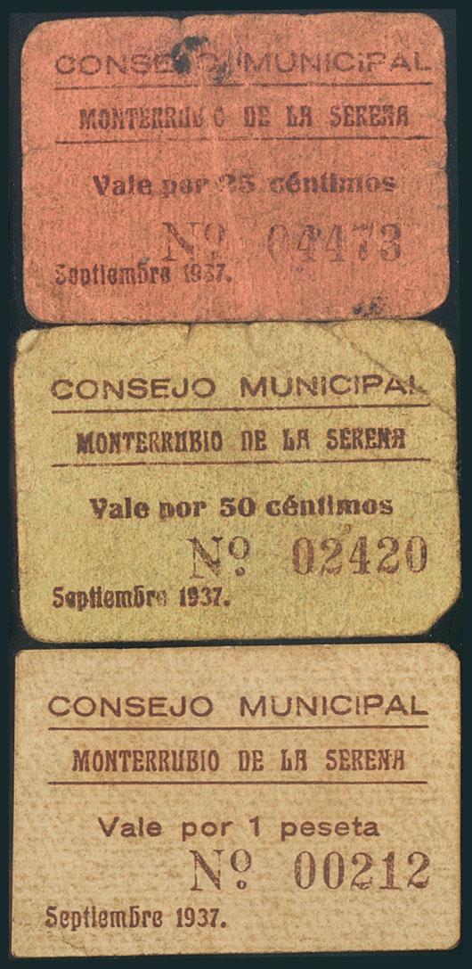 MONTERRUBIO DE LA SERENA (BADAJOZ). 25 Céntimos, 50 Céntimos y 1 Peseta. Septiembre 1937. (González: 3646/48). Raro conjunto. MBC/RC.