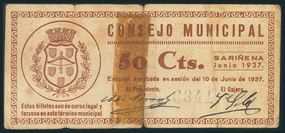 SARIÑENA (HUESCA). 50 Céntimos. 10 de Junio de 1937. (González: 4785). Presencia de restos de cinta adhesiva. RC.