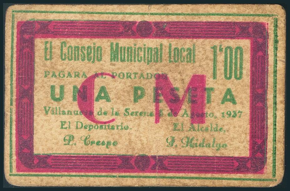 VILLANUEVA DE LA SERENA (BADAJOZ). 1 Peseta. 5 de Agosto de 1937. (González: 5650). Raro. BC.