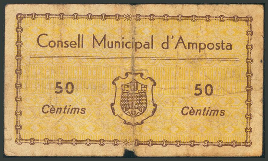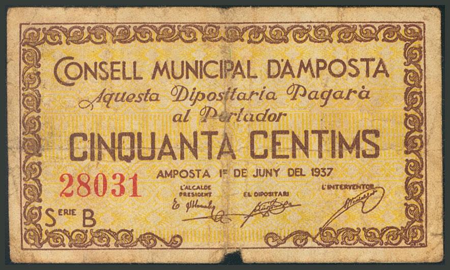 AMPOSTA (TARRAGONA). 50 Céntimos. 1 de Junio de 1937. Serie B. (González: 6275). BC.