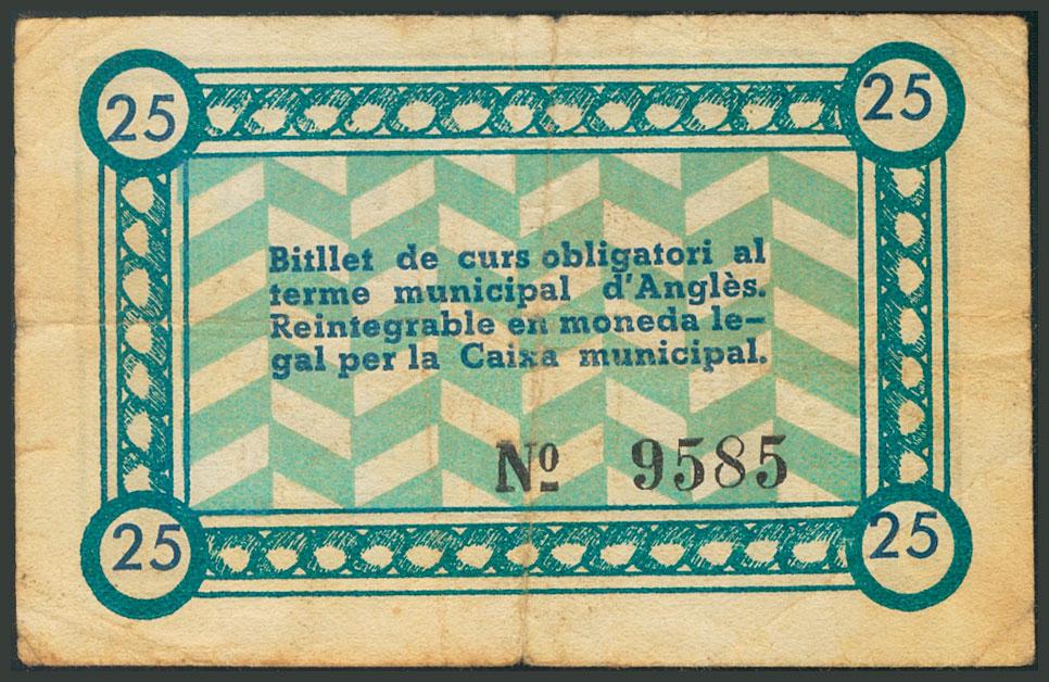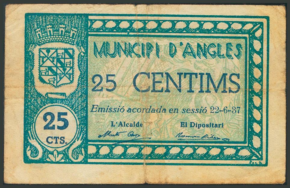 ANGLES (GERONA). 25 Céntimos. 22 de Junio de 1937. (González: 6289). MBC.