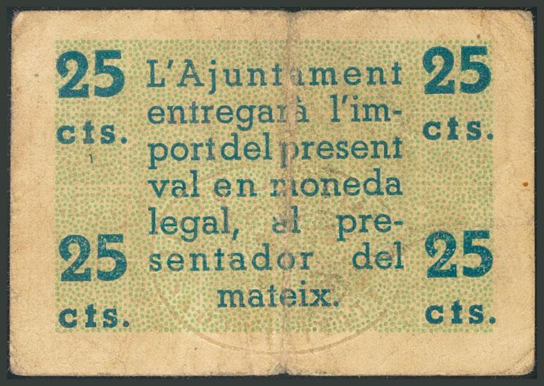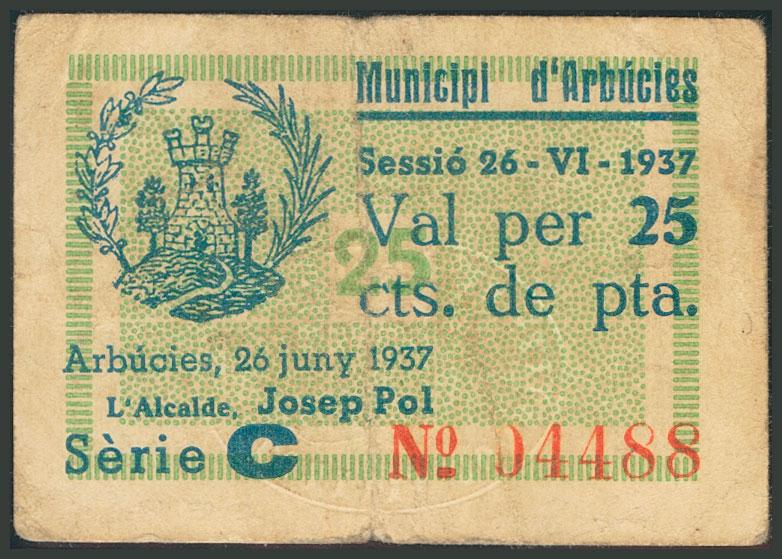 ARBUCIES (GERONA). 25 Céntimos. 26 de Junio de 1937. Serie C. (González: 6324). BC.