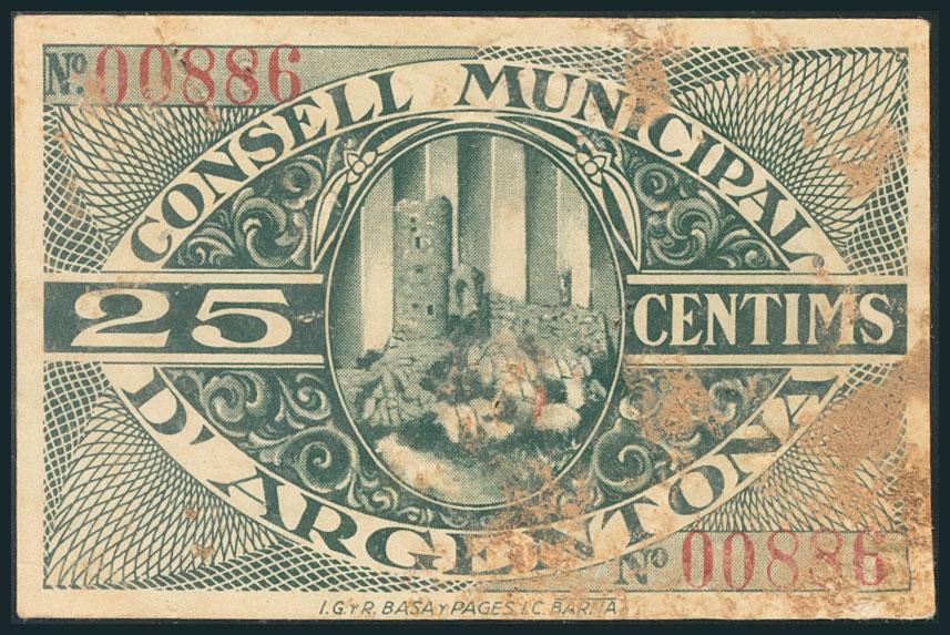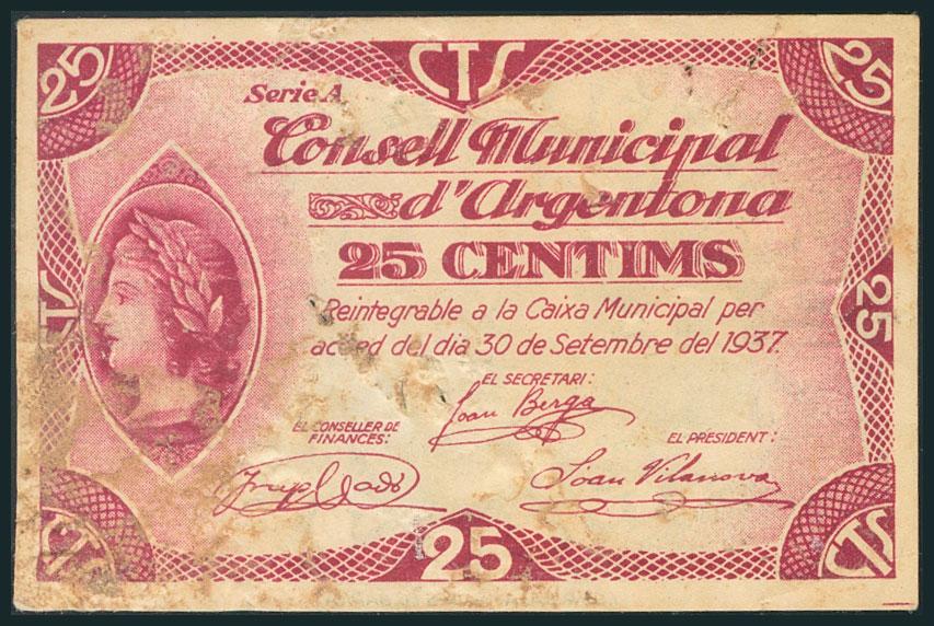 ARGENTONA (BARCELONA). 25 Céntimos. 30 de Octubre de 1937. (González: 6390). RC.