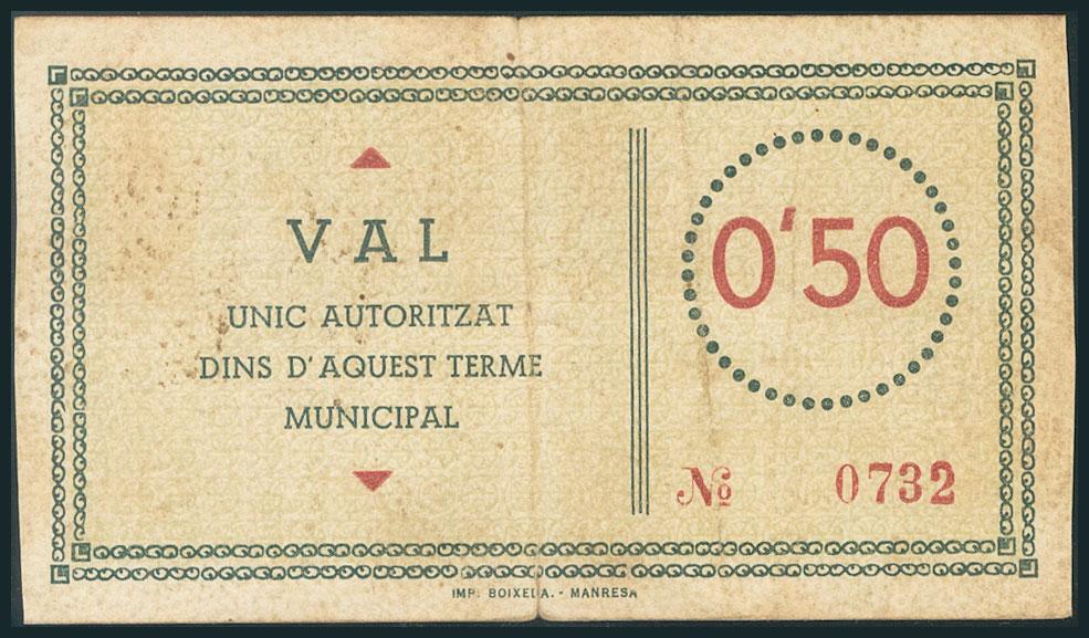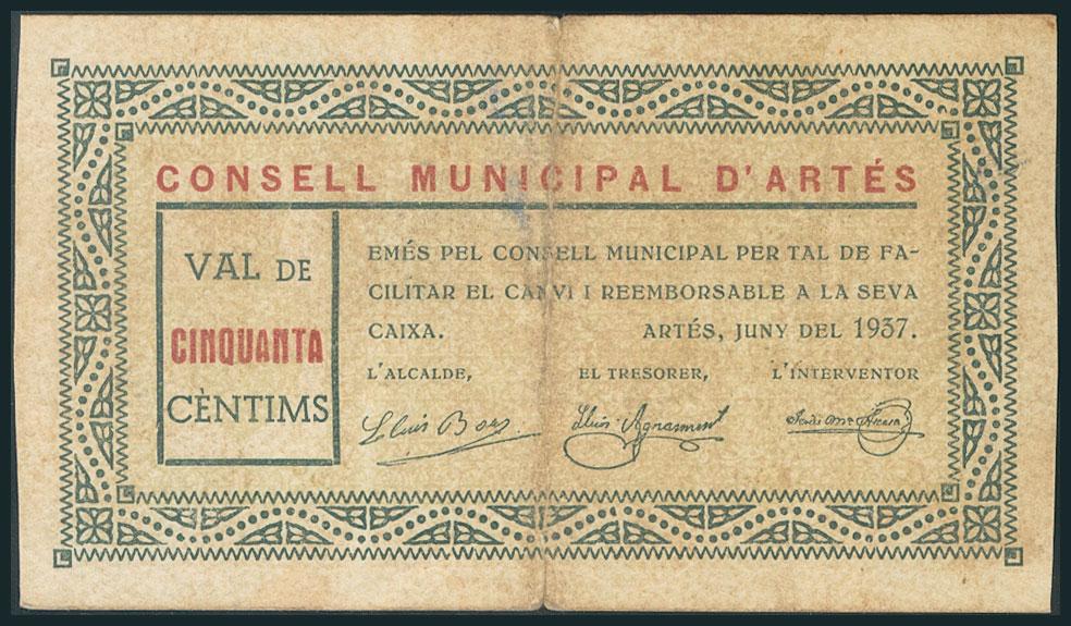 ARTES (BARCELONA). 50 Céntimos. Junio 1937. (González: 6411). Raro. MBC.