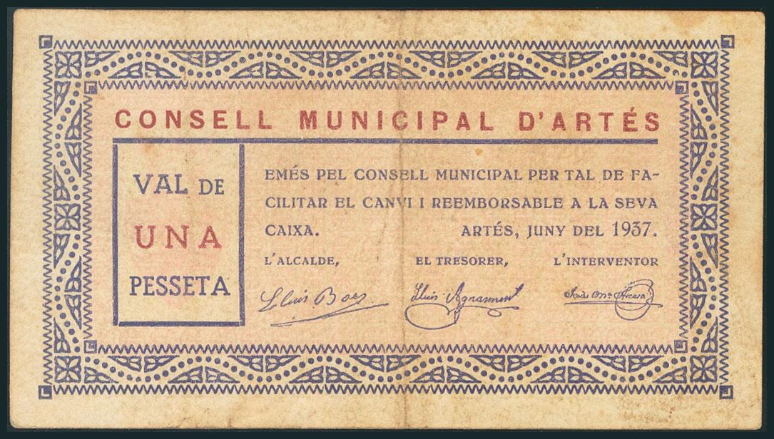 ARTES (BARCELONA). 1 Peseta. Junio 1937. (González: 6412). Raro. MBC.