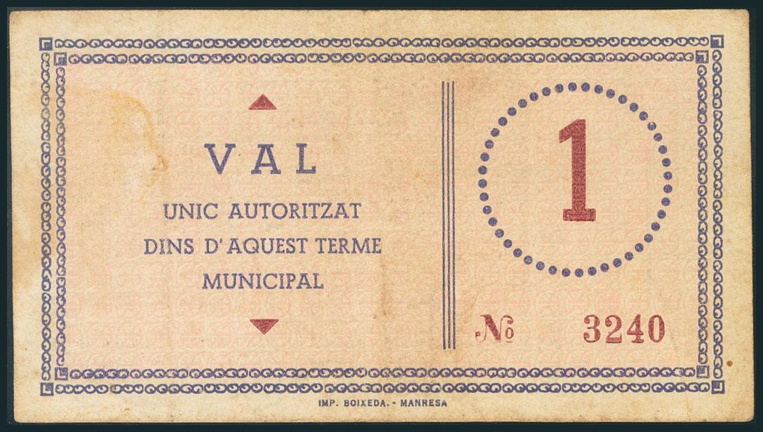 ARTES (BARCELONA). 1 Peseta. Junio 1937. (González: 6412). Raro. MBC.