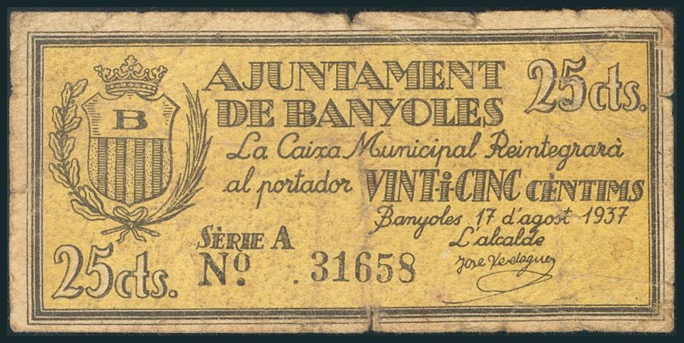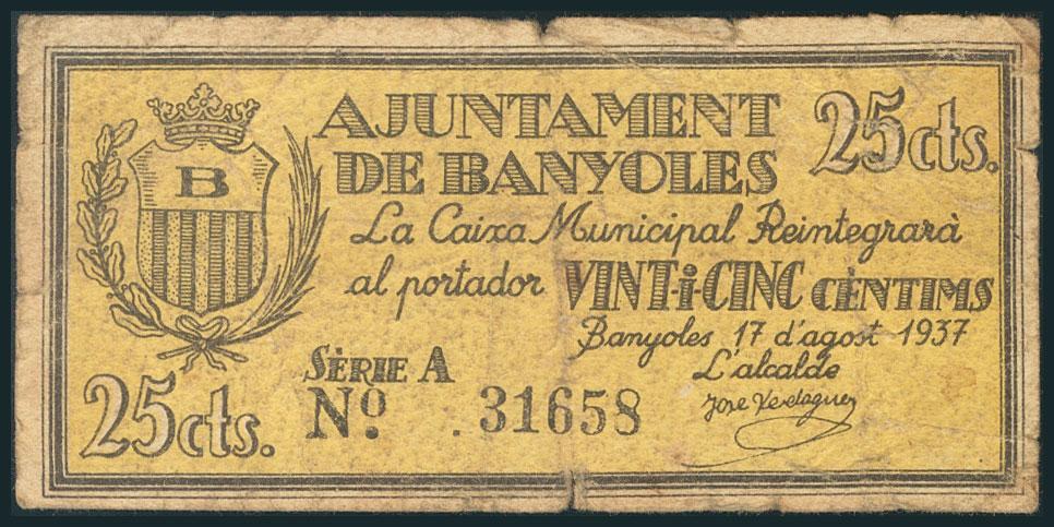BANYOLES (GERONA). 25 Céntimos. 17 de Agosto de 1937. Serie A. (González: 6506). RC.