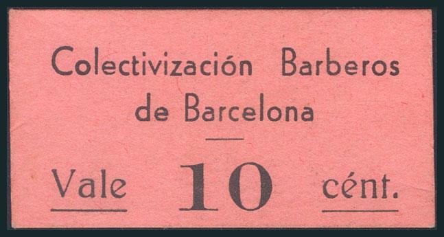 BARCELONA. 10 Céntimos. Colectivización de Barberos. (1938ca). (González: 6658). Raro. EBC.