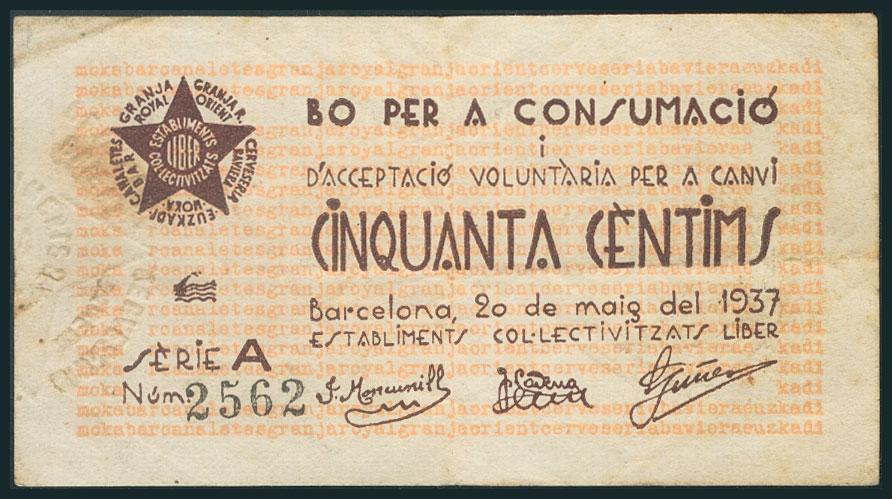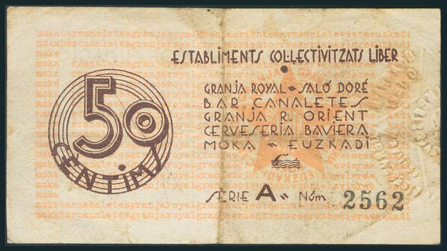 BARCELONA (ESTABLECIMENTS COLLECTIVIZATS LIBER). 5 Céntimos. 20 de Mayo de 1937. Serie A. (González: 6714). BC.