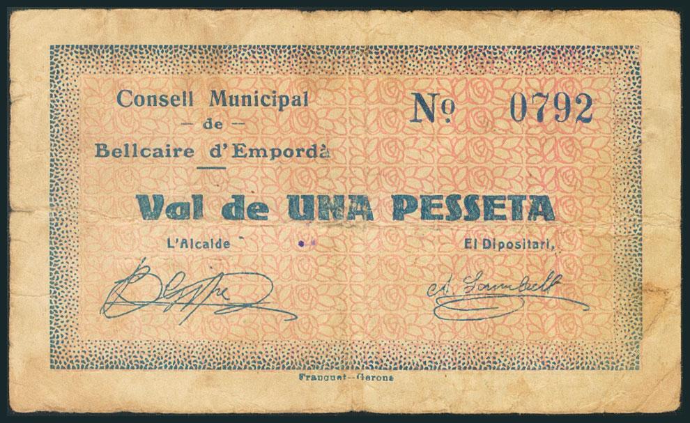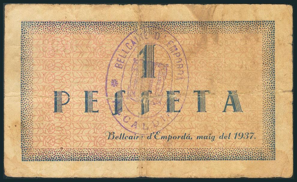 BELLCAIRE D´EMPORDA (BARCELONA). 1 Peseta. Mayo 1937. (González: 6961). Muy raro. BC.