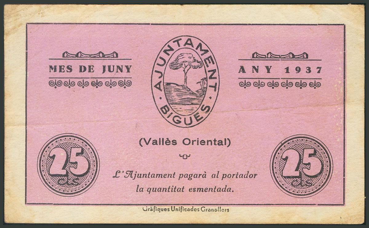 BIGUES (BARCELONA). 25 Céntimos. Junio 1937. (González: 7051). MBC.