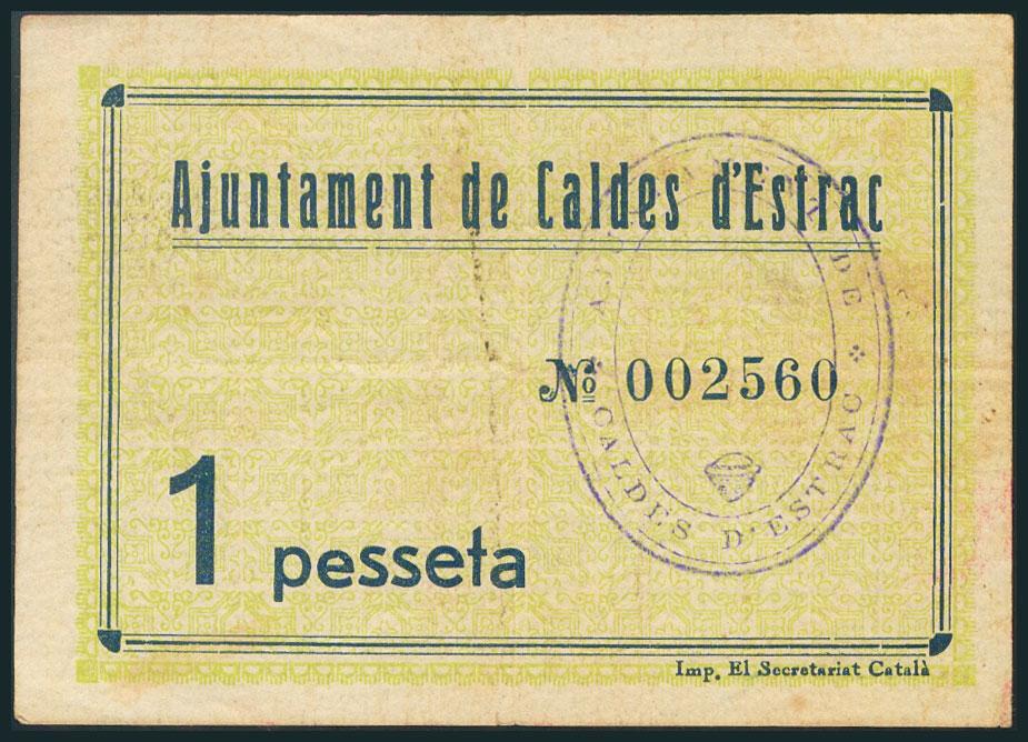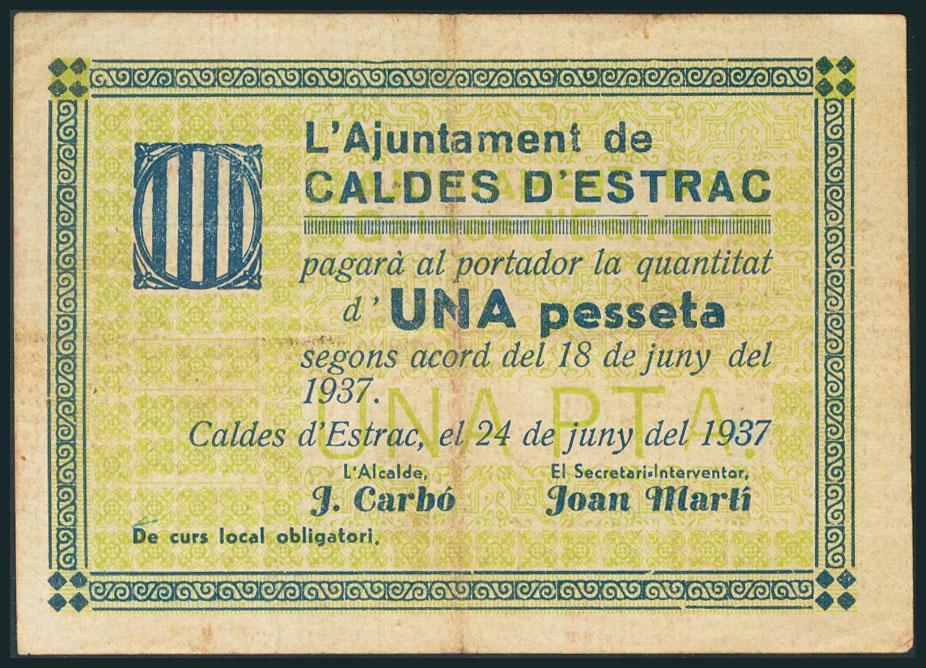 CALDES D´ESTRAC (BARCELONA). 1 Peseta. 24 de Junio de 1938. (González: 7275). MBC.