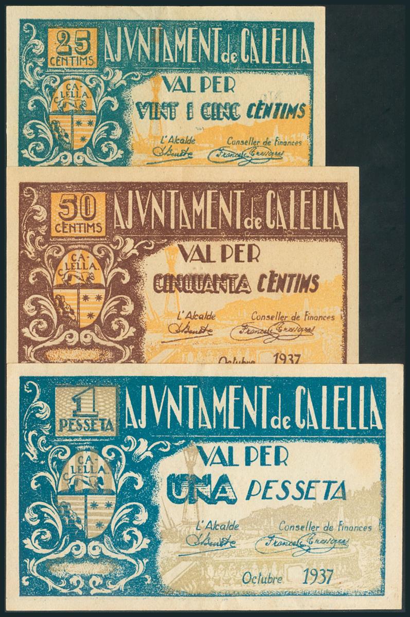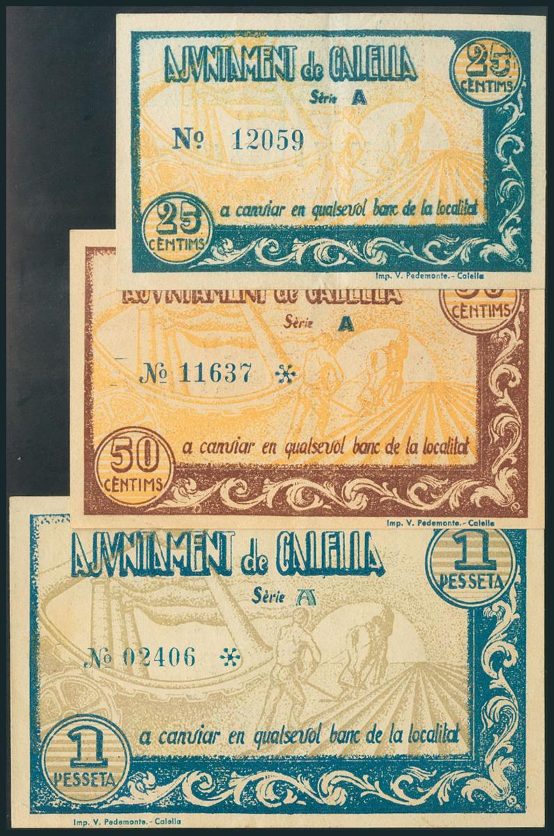 CALELLA (BARCELONA). 25 Céntimos, 50 Céntimos y 1 Peseta. Octubre 1937. Serie A, los tres billetes. (González: 7290/92). EBC.