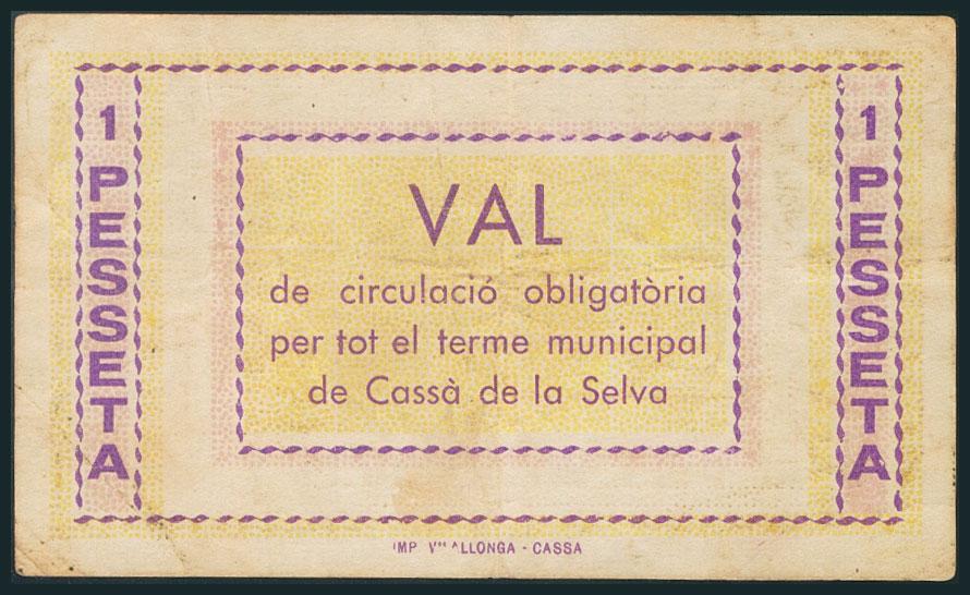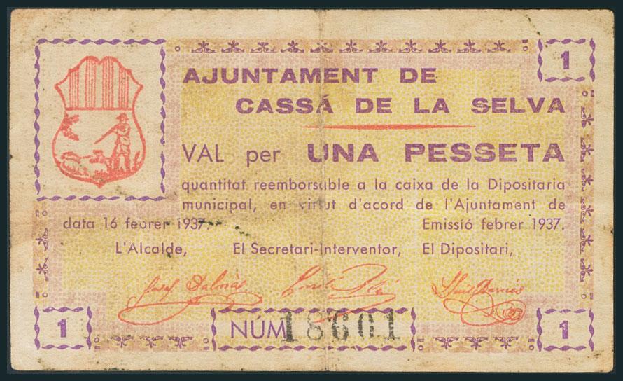 CASSA DE LA SELVA (GERONA). 1 Peseta. 16 de Febrero de 1937. (González: 7408). BC.