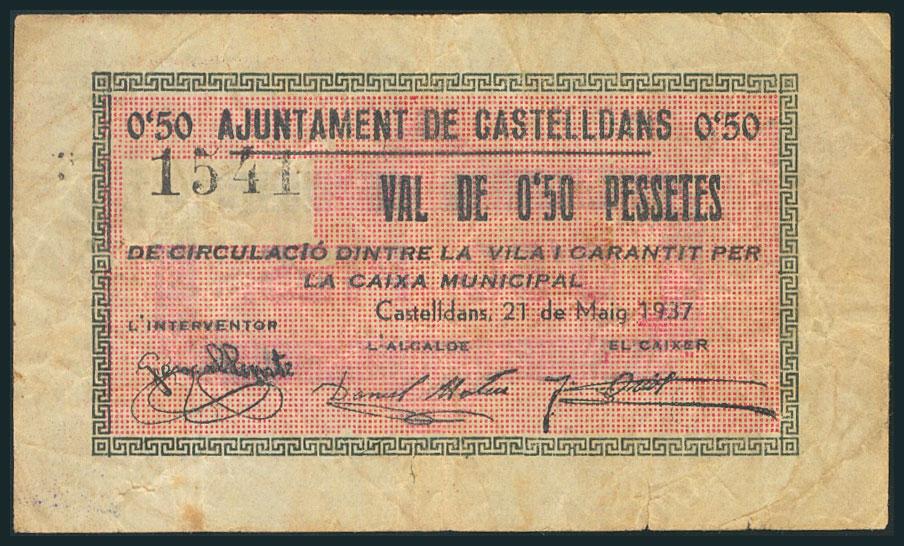 CASTELLDANS. 50 Céntimos. 21 de Mayo de 1937. (González: 7437). Muy raro. MBC.