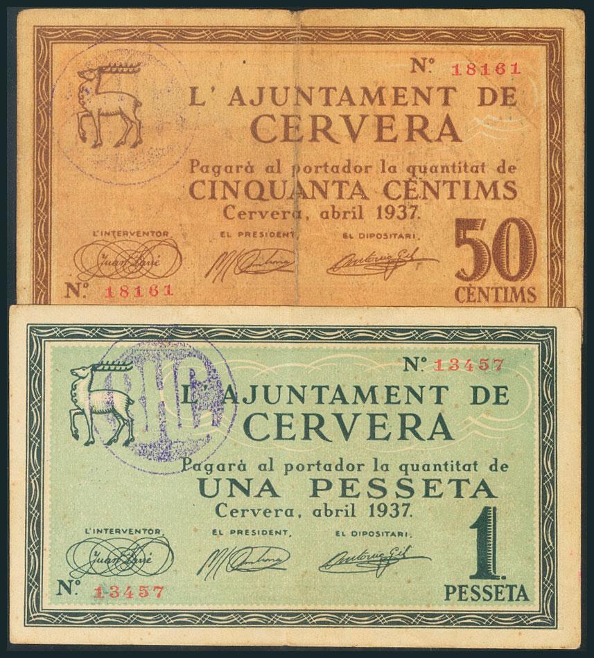 CERVERA (LERIDA). 50 Céntimos y 1 Peseta. Abril 1937. (González: 7556/57). MBC/BC.