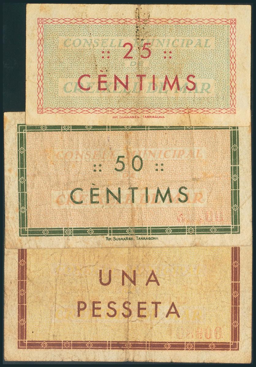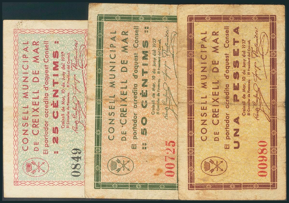 CREIXELL DE MAR (TARRAGONA). 25 Céntimos, 50 Céntimos y 1 Peseta. 10 de Mayo de 1937. (González: 7700/02). Raros. BC.